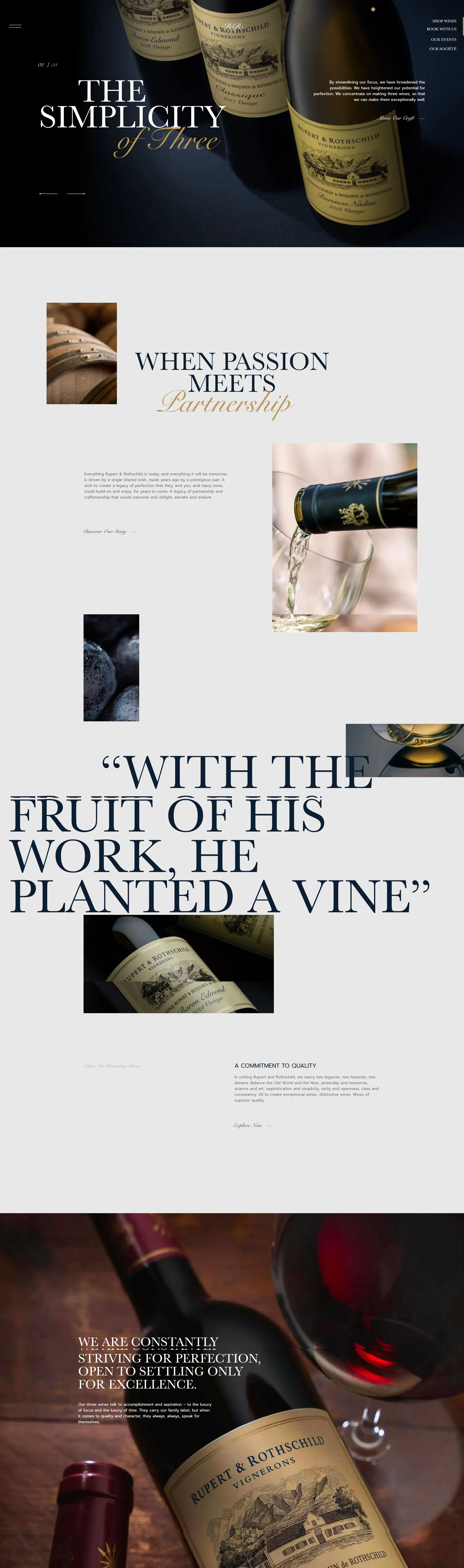 Страница о компании Rupert Rothschild Vignerons, тематика — Еда и напитки, цвета — Белый, Черный, стиль — Классический, Корпоративный, типографика — С засечками, Без засечек