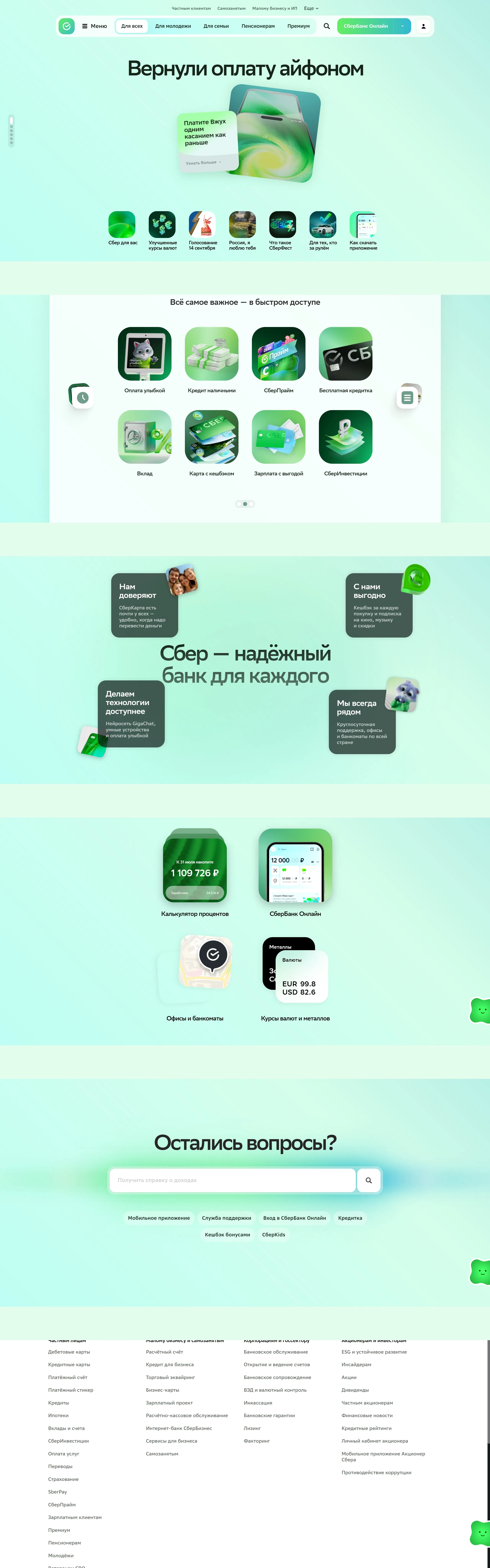 Секция «Первый экран» с сайта https://www.sberbank.ru/ru/, тематика — Финансы, цвета — Белый, стиль — Корпоративный, типографика — Без засечек