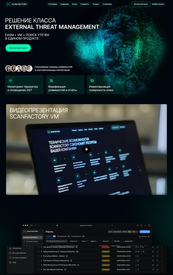 Компания предоставляет решения в области управления внешними угрозами, включая мониторинг периметра, сканирование уязвимостей и услуги пентестирования. Они предлагают комплексные решения для анализа защищенности и верификации уязвимостей.