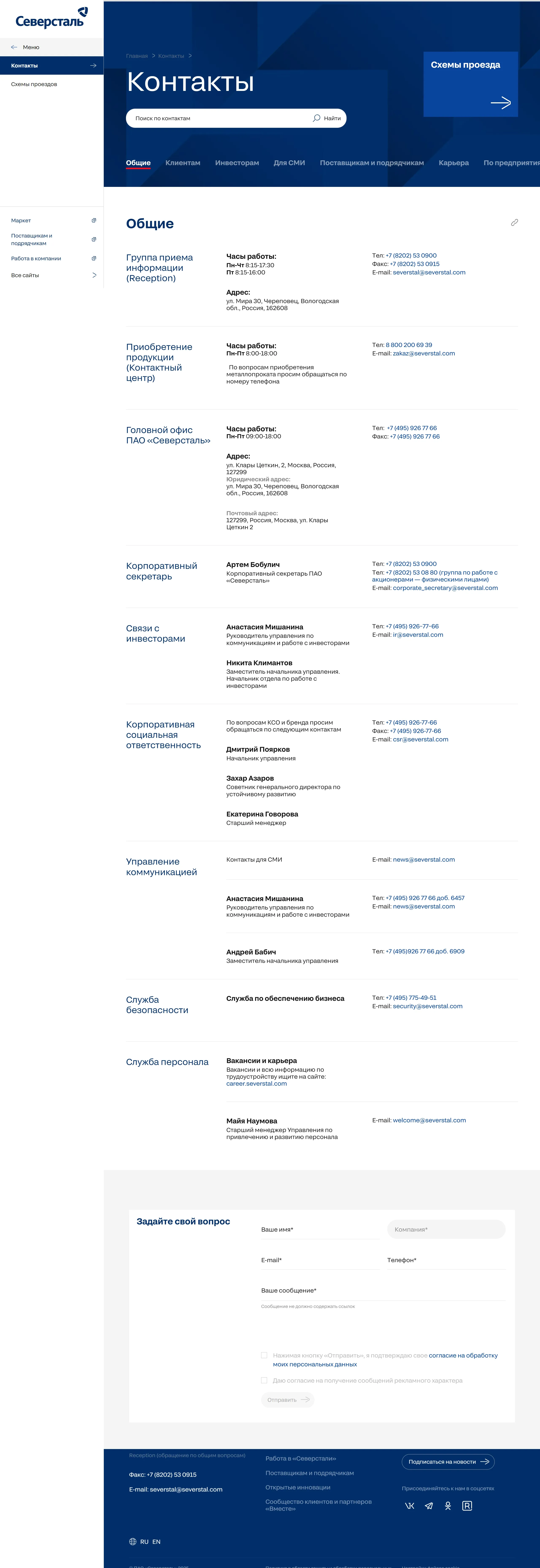 Контакты Северсталь, тематика — Производство, цвета — Белый, Черный, стиль — Корпоративный, типографика — Без засечек