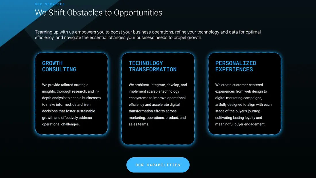 Компания предоставляет инновационные решения для повышения бизнес-стратегий, предлагая экспертное руководство в области цифровой трансформации и вовлечения клиентов. Она фокусируется на стратегии, объединяющей технологии, искусственный интеллект, опыт и данные для достижения значительных результатов.