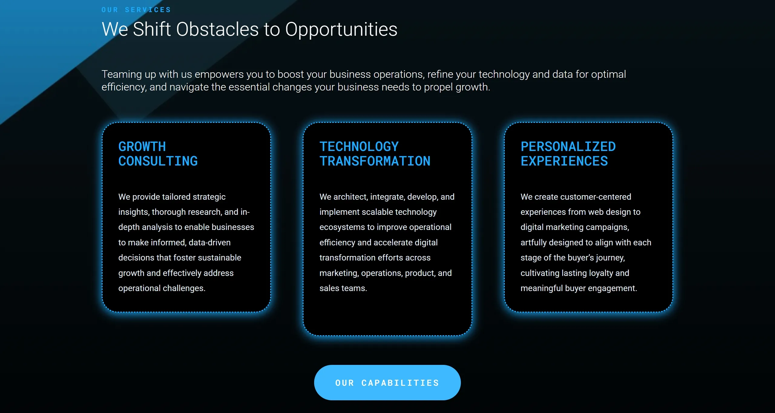 Компания предлагает инновационные решения для улучшения бизнес-стратегий, обеспечивая экспертные услуги в области цифровой трансформации и взаимодействия с клиентами. Их стратегический подход сосредоточен на использовании технологий, искусственного интеллекта и данных для достижения значительных результатов.