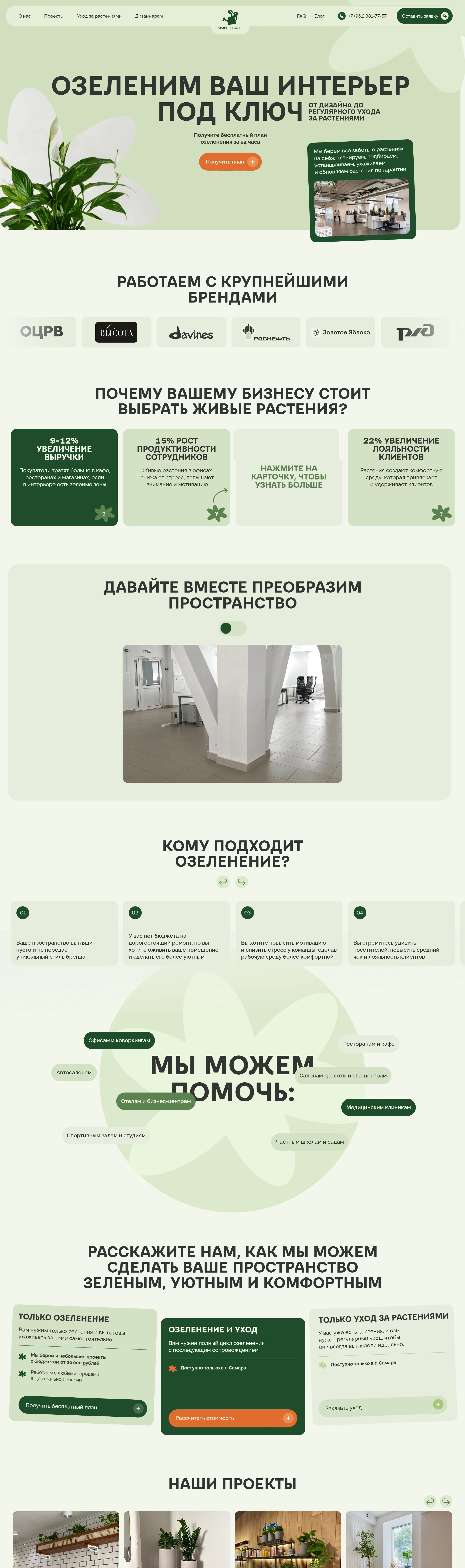 Компания предоставляет услуги озеленения для офисов, бизнес-центров и заведений HoReCa в Самаре и Тольятти, включая фитодизайн и вертикальное озеленение, а также профессиональный уход за растениями.