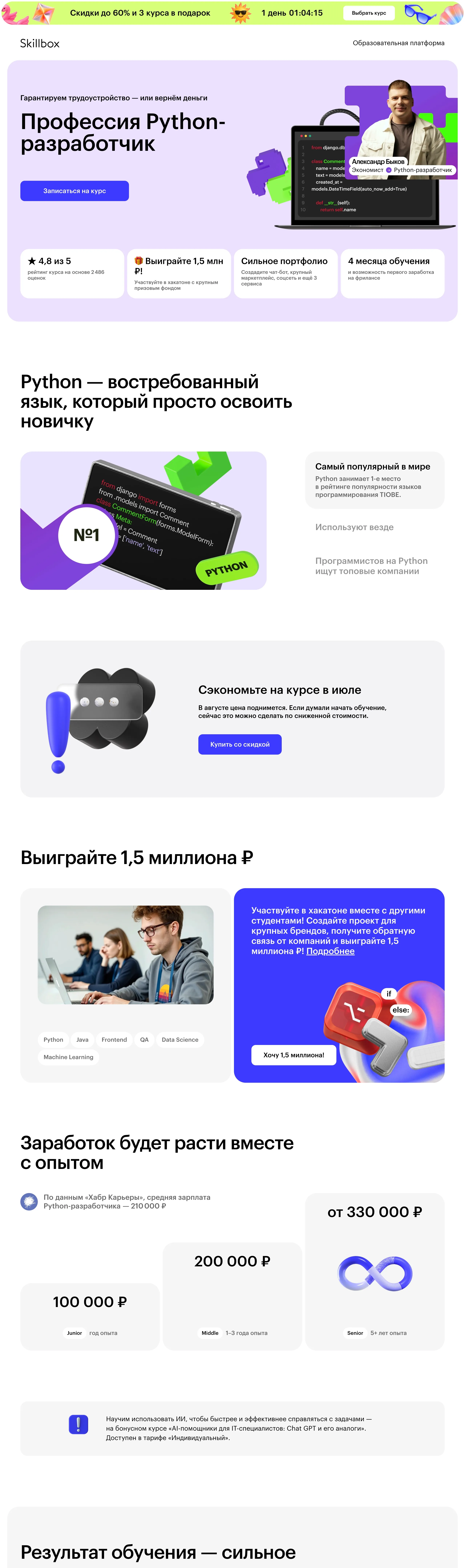 Skillbox — это онлайн-образовательная платформа, предлагающая курсы для начинающих, включая программу по обучению языку Python, которая позволяет студентам разработать портфолио и получить помощь в трудоустройстве.