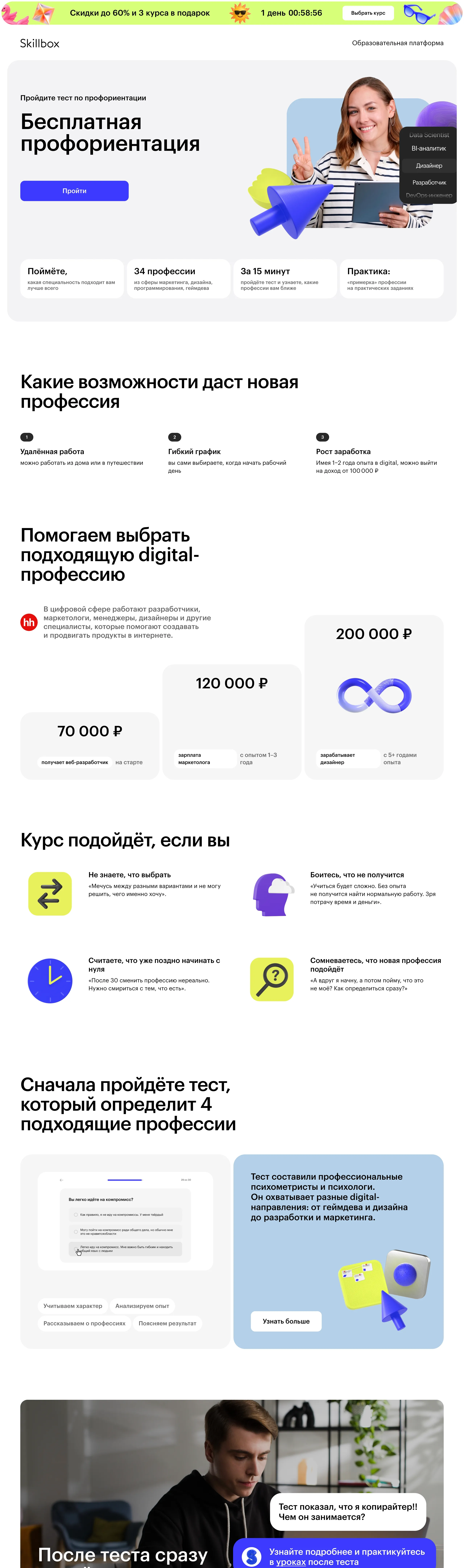 Бесплатная профориентация для взрослых, предлагающая помощь в выборе новой профессии из 34 вариантов с поддержкой опытного психолога и профориентолога. Курс доступен в онлайн-формате для всех регионов России.