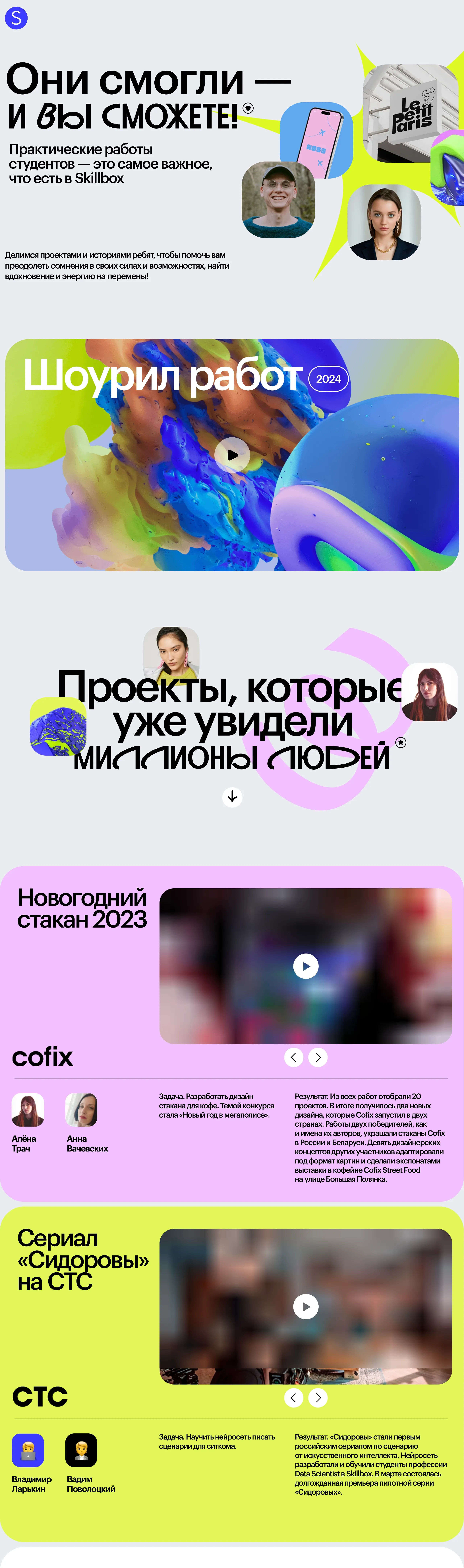 Skillbox — это образовательная платформа, которая делится проектами и историями своих студентов, помогая им преодолевать сомнения и находить вдохновение для перемен. Платформа акцентирует внимание на практических работах студентов, которые являются важным элементом учебного процесса.