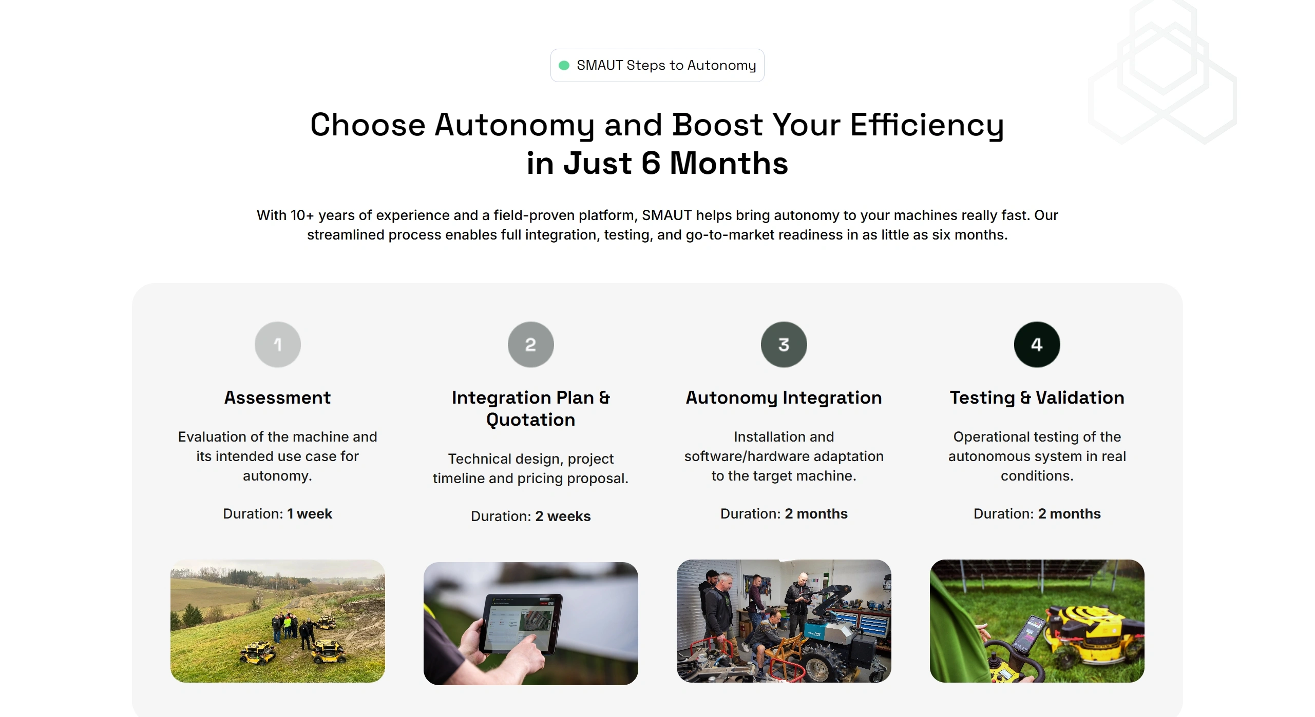 SMAUT builds certified autonomous mowing systems for solar parks, vineyards, and airports, offering proven, safe solutions for real-world application. Their modular control platform enables rapid, safe automation for various outdoor tasks.