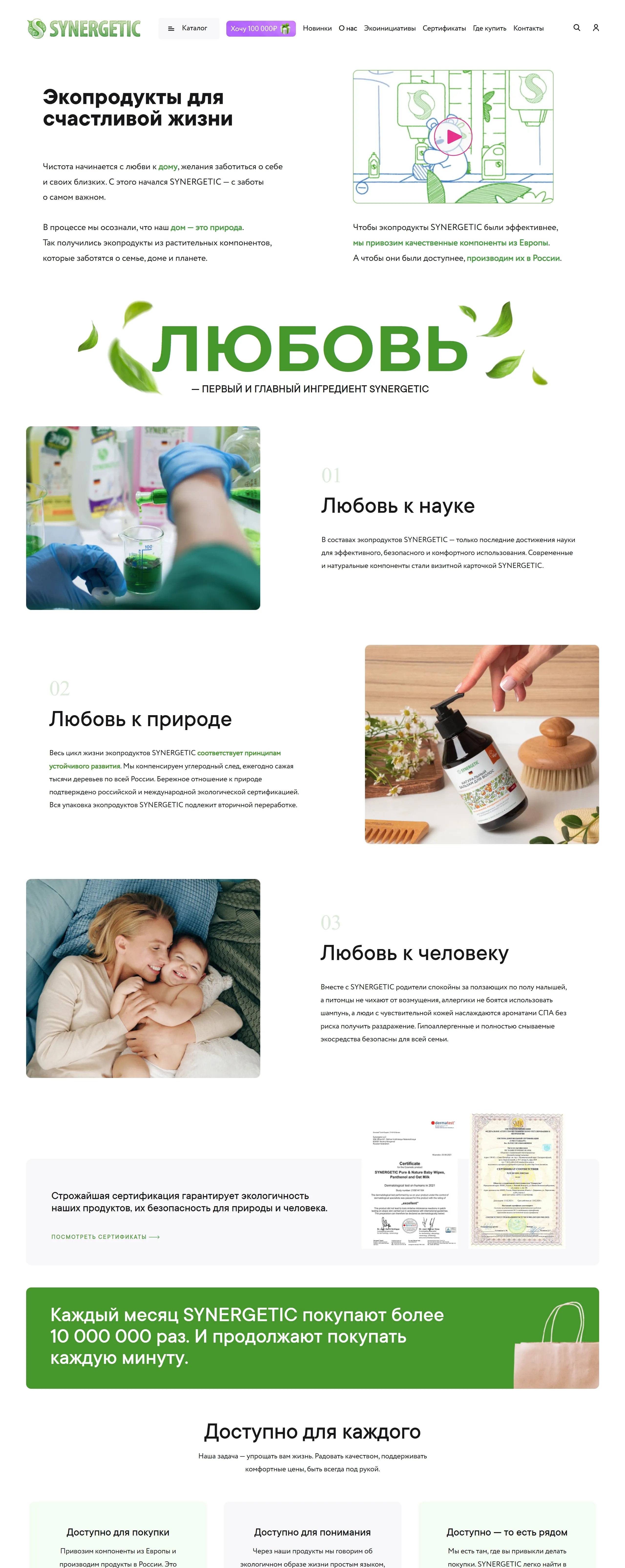 Компания предлагает экологичные средства для стирки и уборки, а также натуральную косметику, акцентируя внимание на высоких скидках и различных акциях.