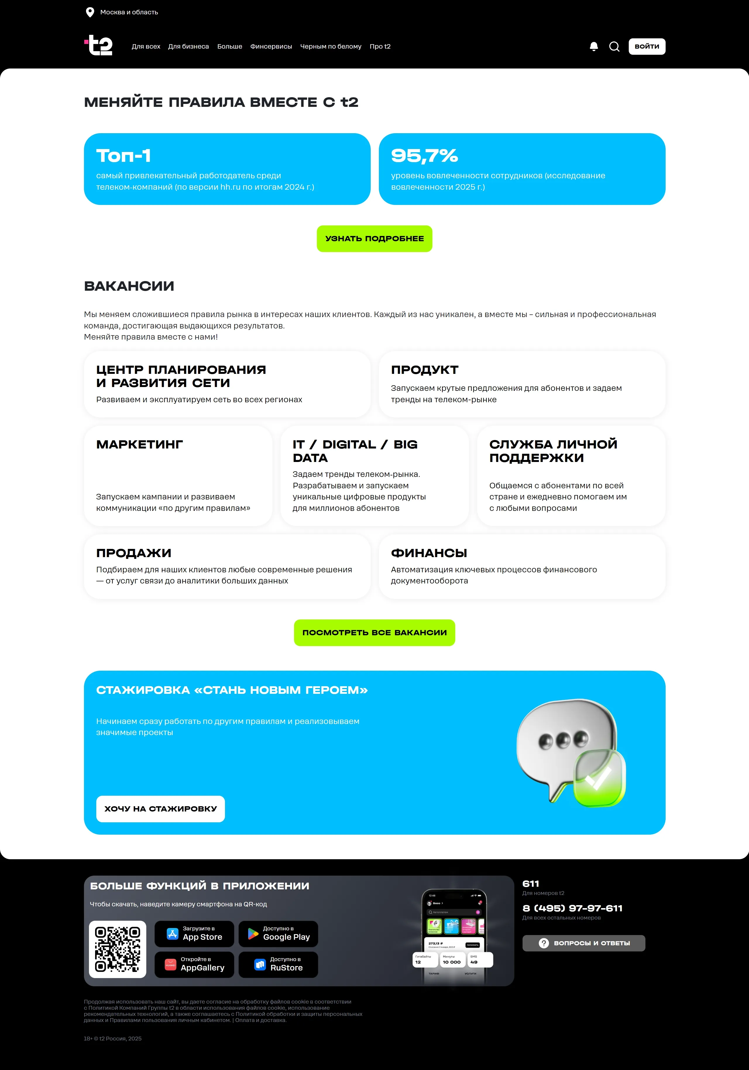 Страница карьеры t2, тематика — Телекоммуникации, цвета — Белый, Черный, Синий, стиль — Корпоративный, типографика — Без засечек
