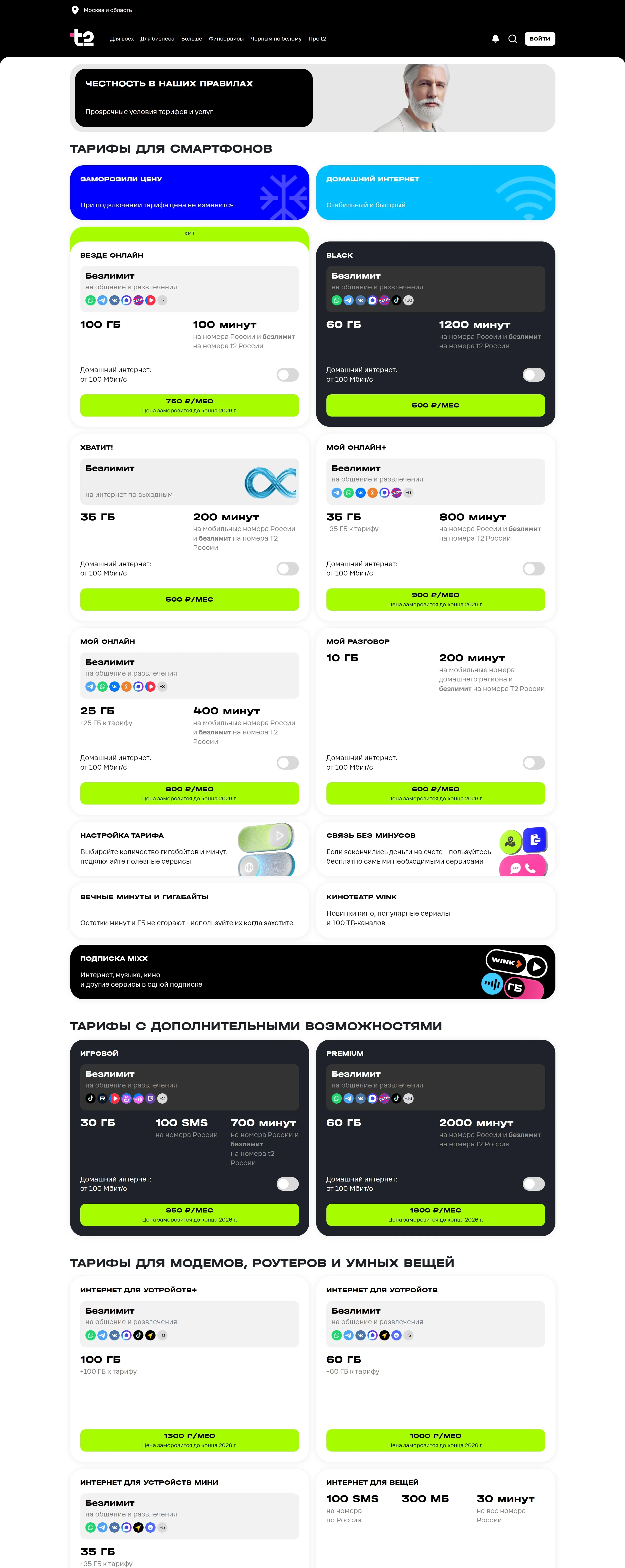 Главная t2, тематика — Телекоммуникации, цвета — Белый, Черный, Серый, стиль — Корпоративный, типографика — Без засечек