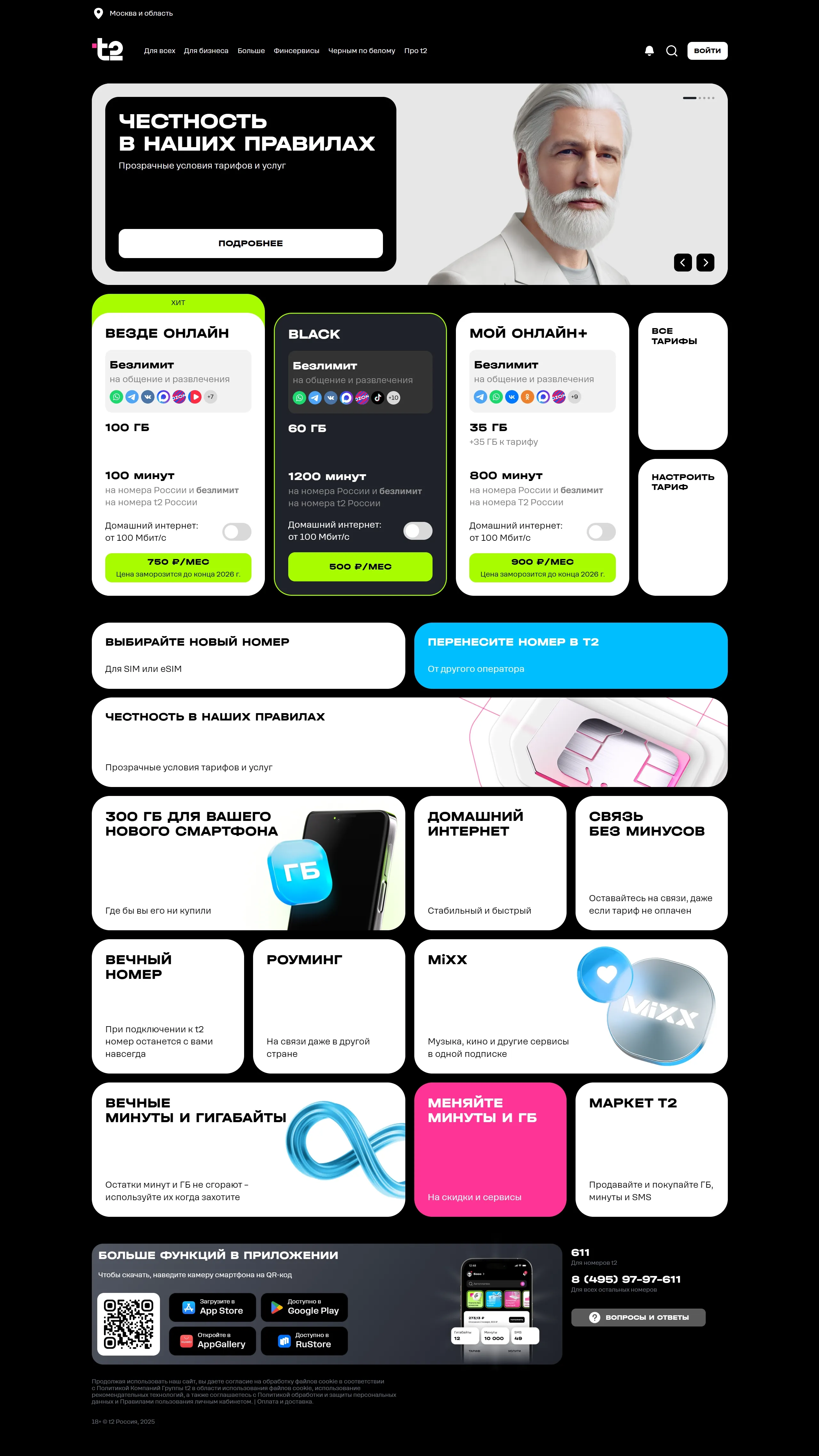 Главная t2, тематика — Телекоммуникации, цвета — Белый, Черный, Серый, стиль — Корпоративный, типографика — Без засечек