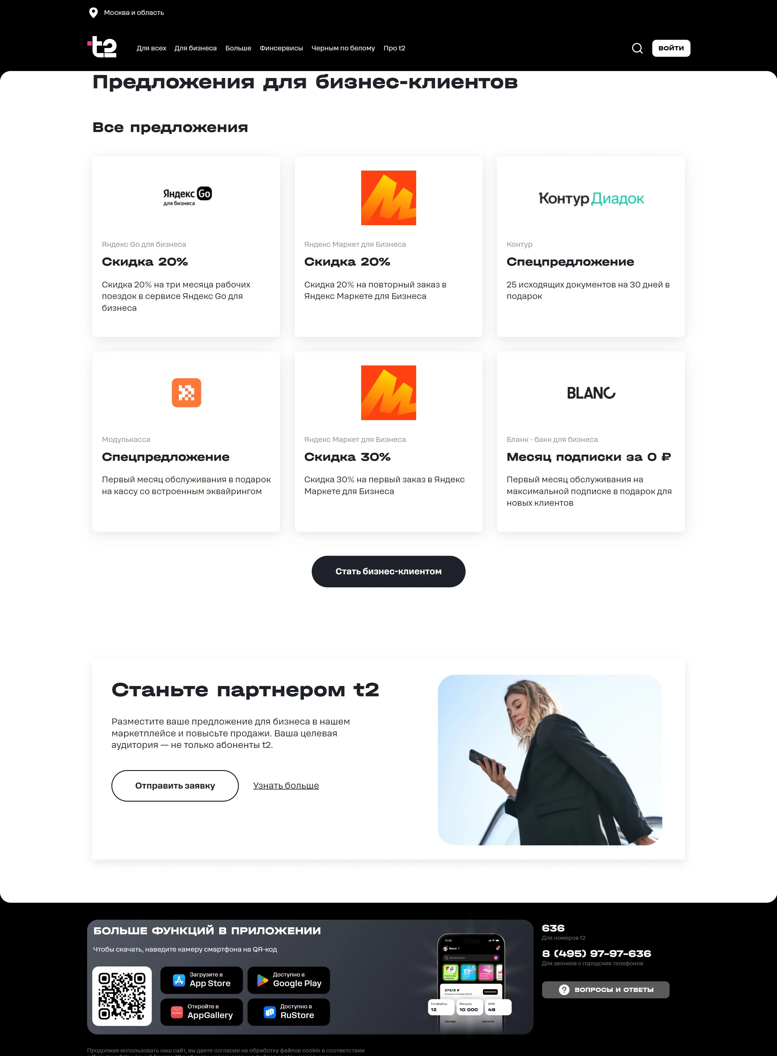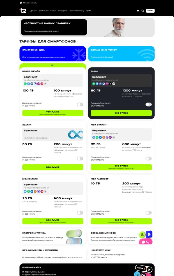 Главная t2, тематика — Телекоммуникации, цвета — Белый, Черный, Серый, стиль — Корпоративный, типографика — Без засечек