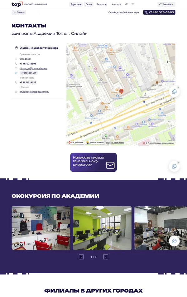 Контакты Академия TOP, тематика — Образование, цвета — Белый, Синий, стиль — Корпоративный, Карточный, типографика — Без засечек