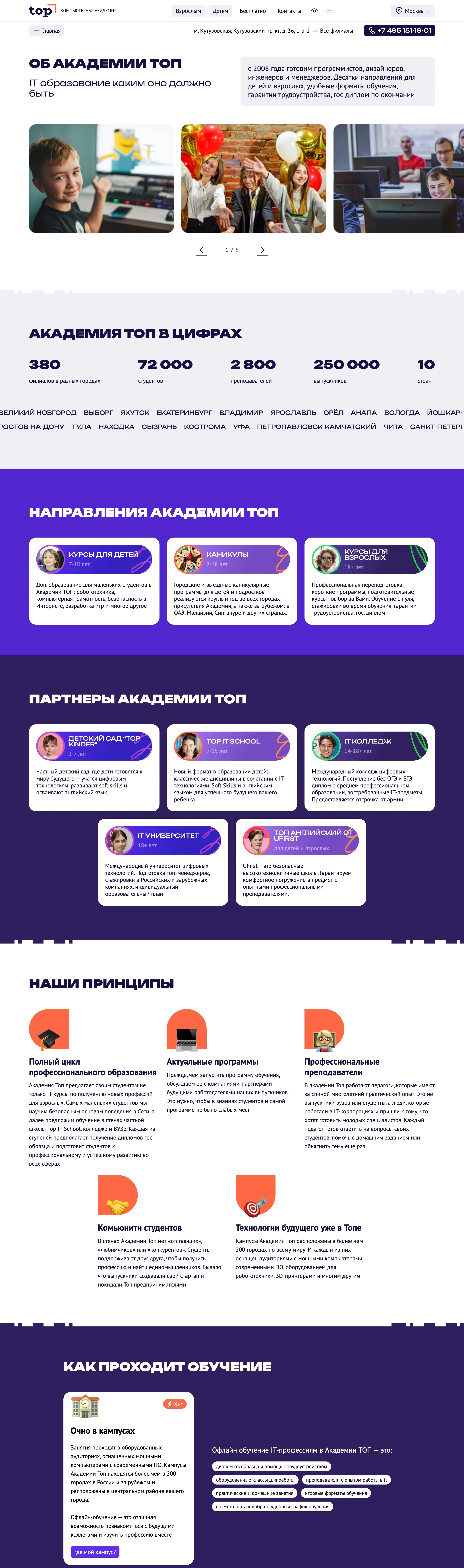 Страница о компании Академия TOP, тематика — Образование, цвета — Белый, Серый, Синий, стиль — Корпоративный, Карточный, типографика — Без засечек