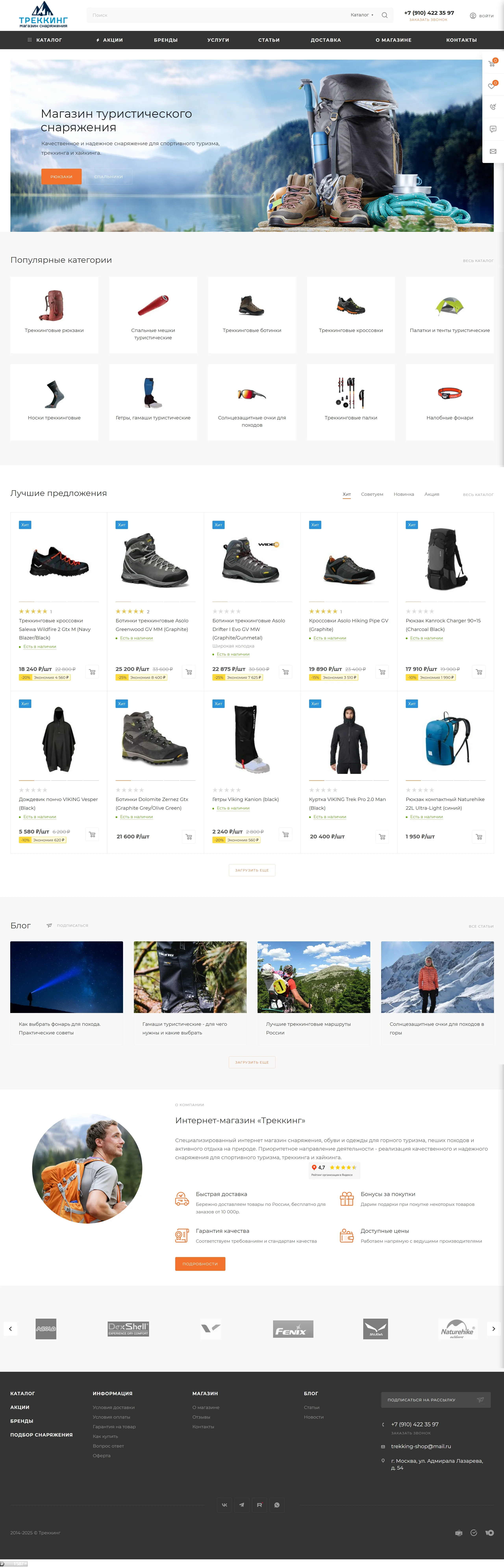 Интернет-магазин предлагает широкий ассортимент снаряжения для туризма, треккинга и альпинизма, а также спортивной одежды и аксессуаров с доставкой по Москве и всем регионам России.