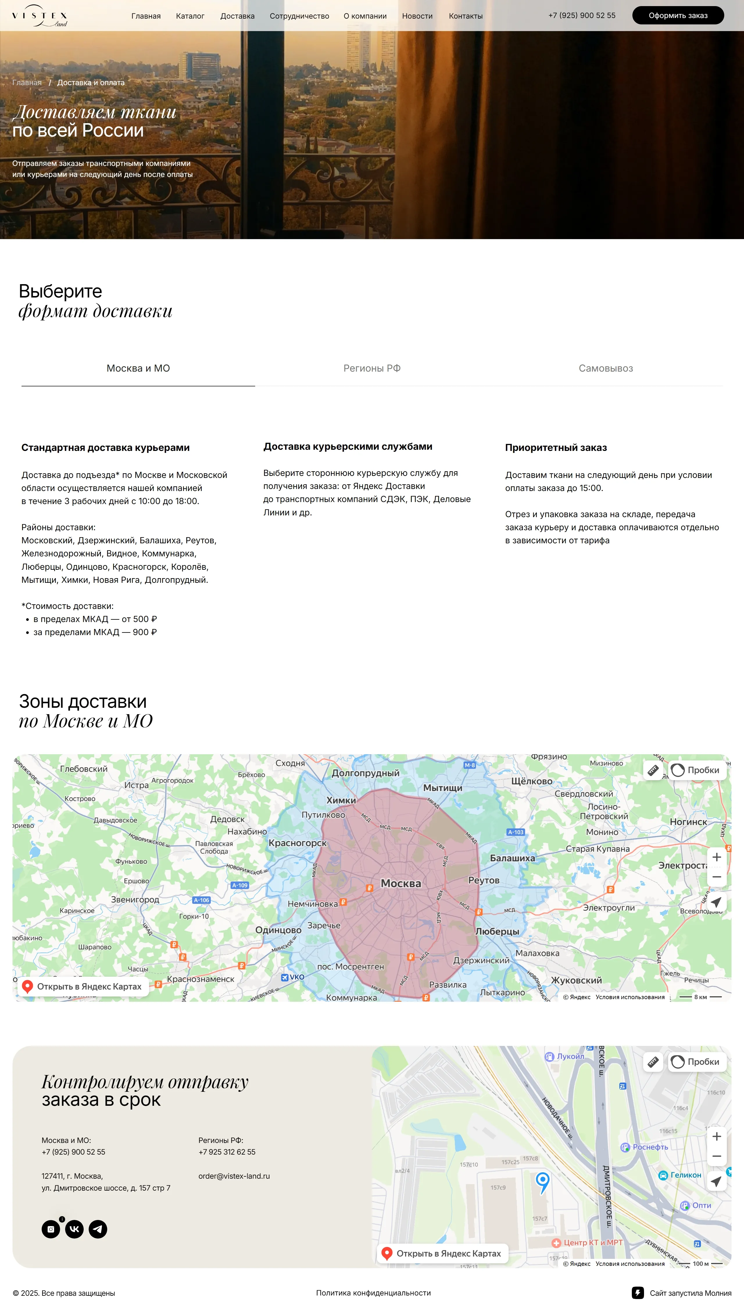 Компания занимается доставкой тканей по всей России, предлагая различные способы доставки и оплаты для удобства клиентов.