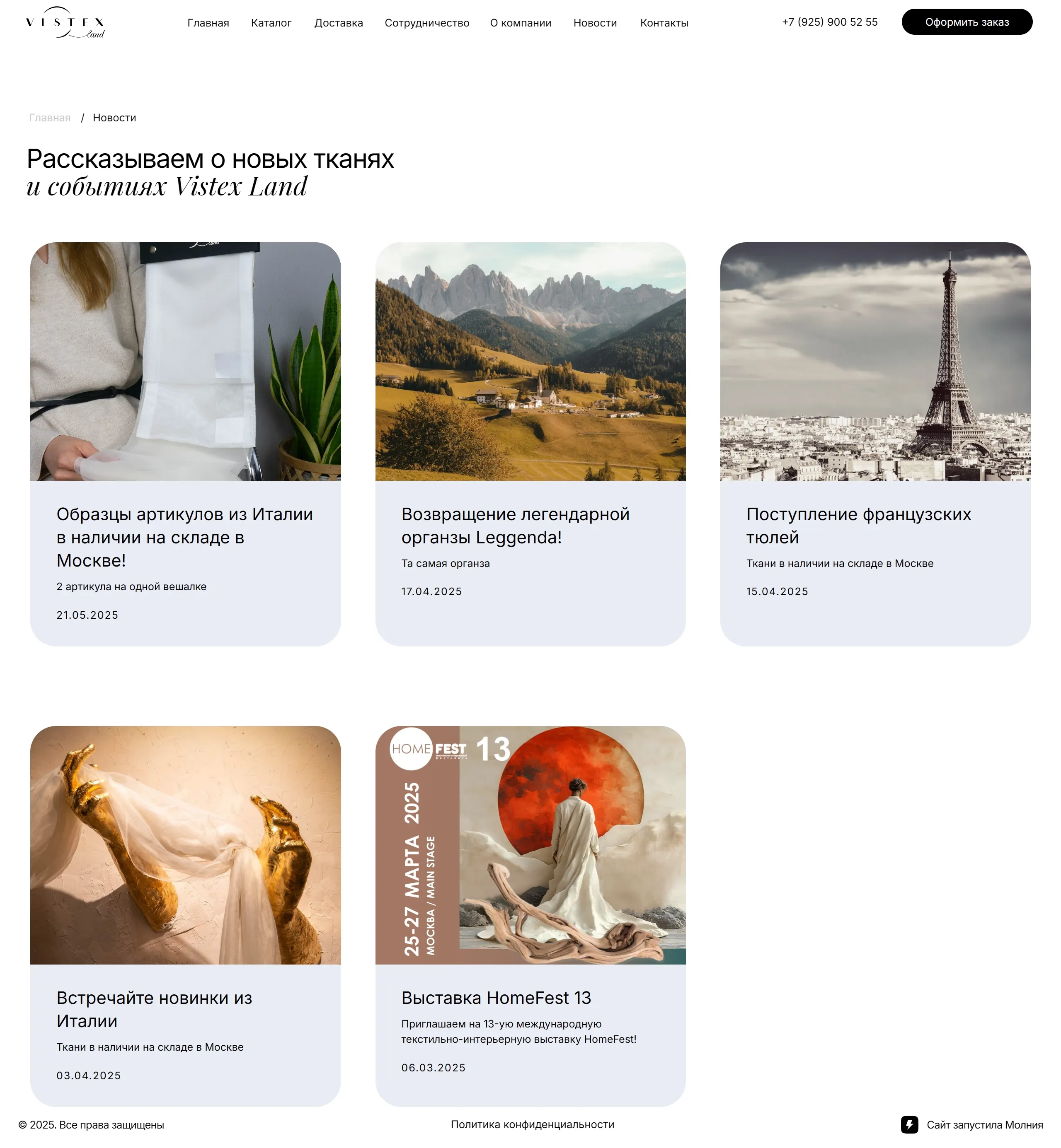 Компания занимается продажей тканей и предоставляет услуги по доставке. Также они информируют о новостях и событиях, связанных с их продукцией.