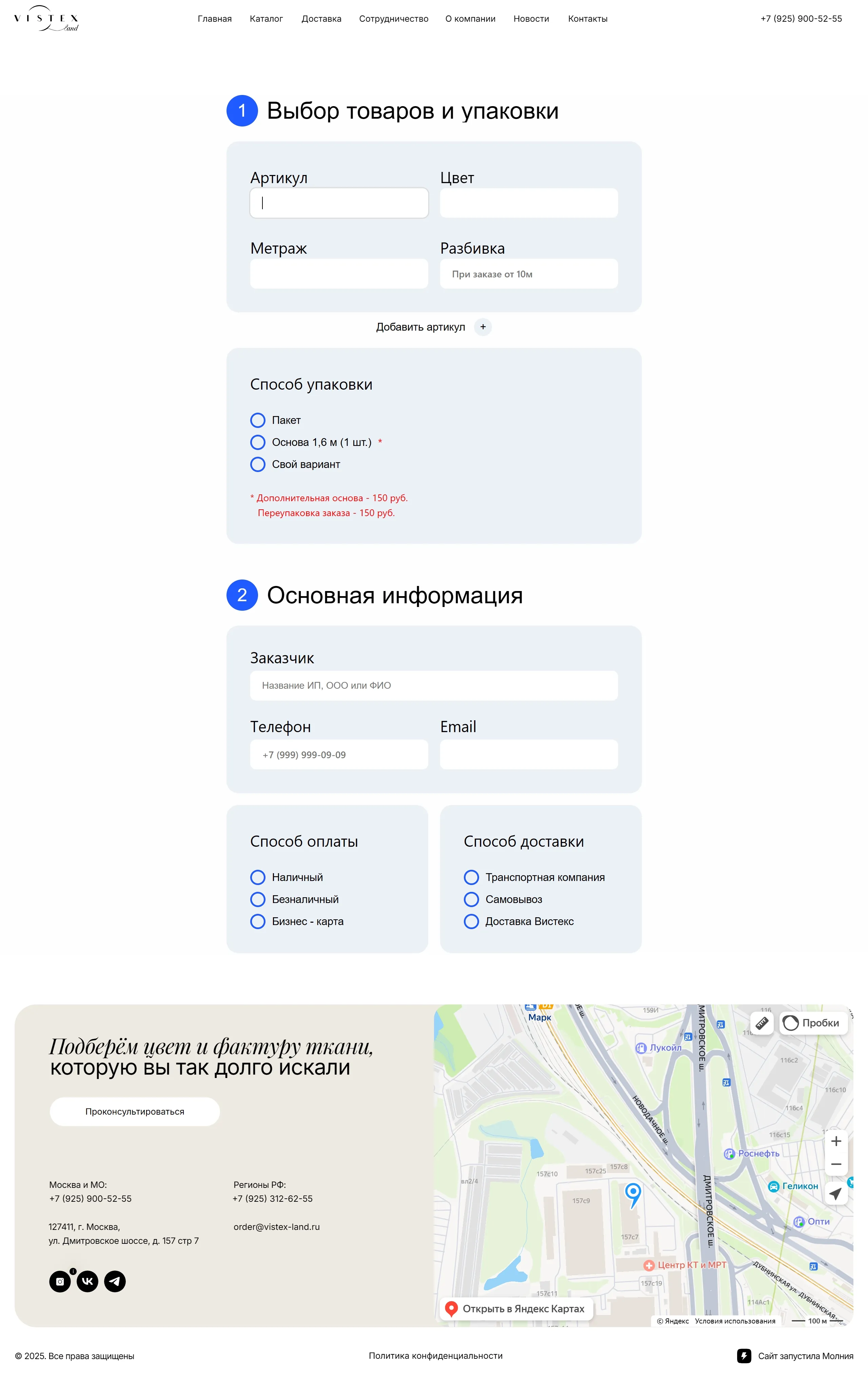 Компания предлагает услуги по оформлению индивидуальных заказов на ткани, обеспечивает доставку и поддерживает сотрудничество с клиентами через удобные каналы связи.