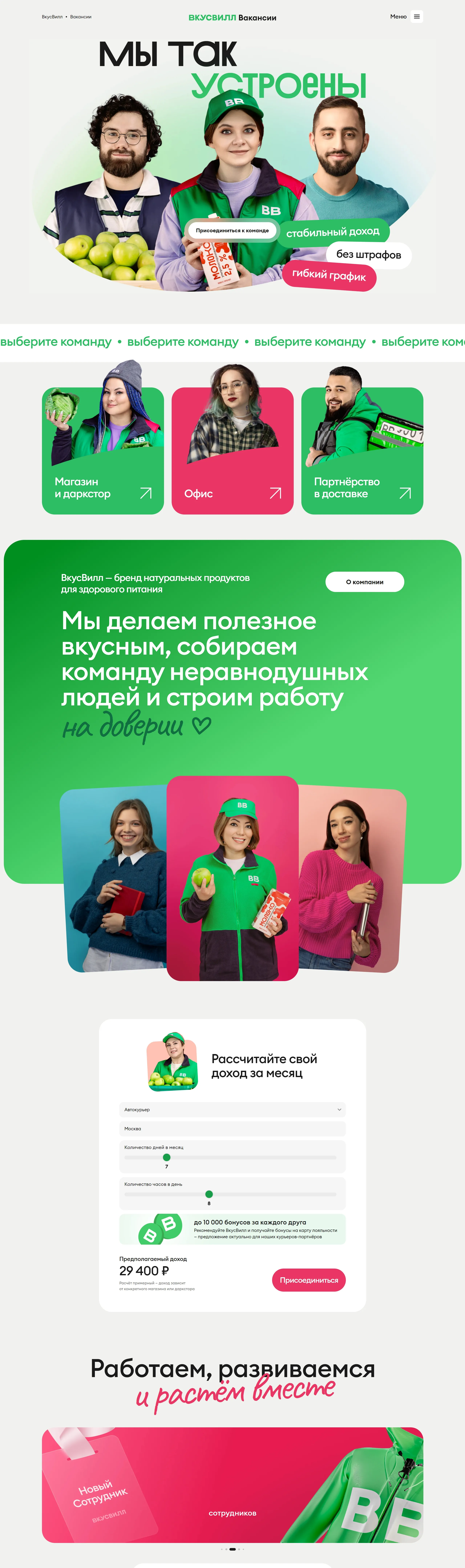 Страница карьеры ВкусВилл, тематика — Еда и напитки, цвета — Белый, Серый, Зеленый, стиль — Корпоративный, типографика — Без засечек