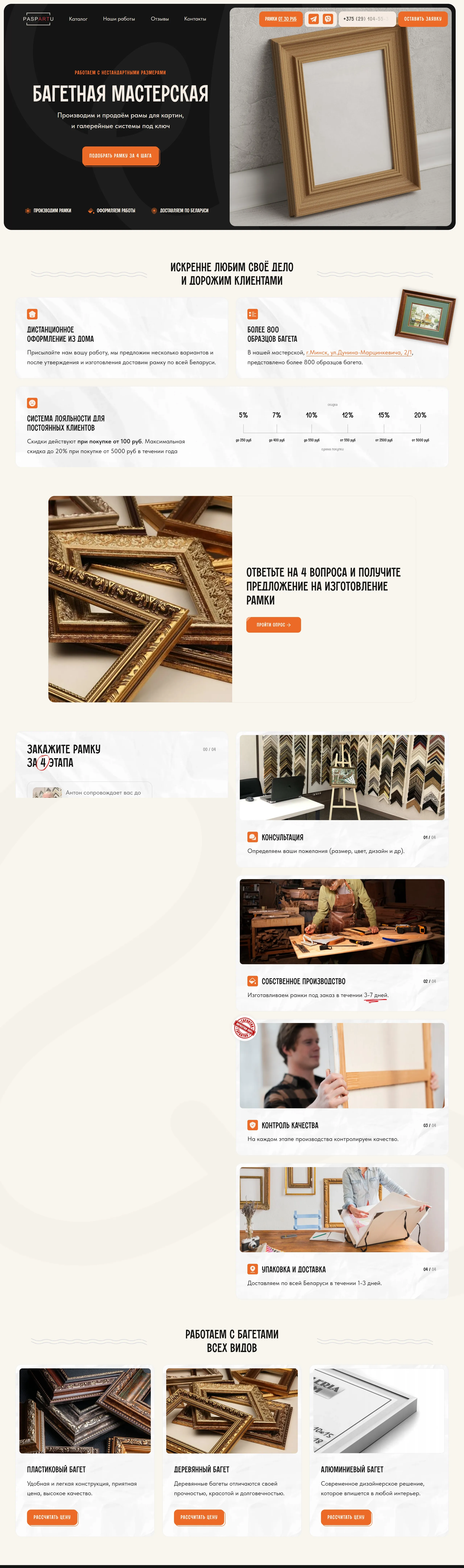 Багетная мастерская в Минске, предлагающая производство и продажу рам для картин, а также галерейные системы под ключ с возможностью дистанционного оформления и большим выбором образцов багета.