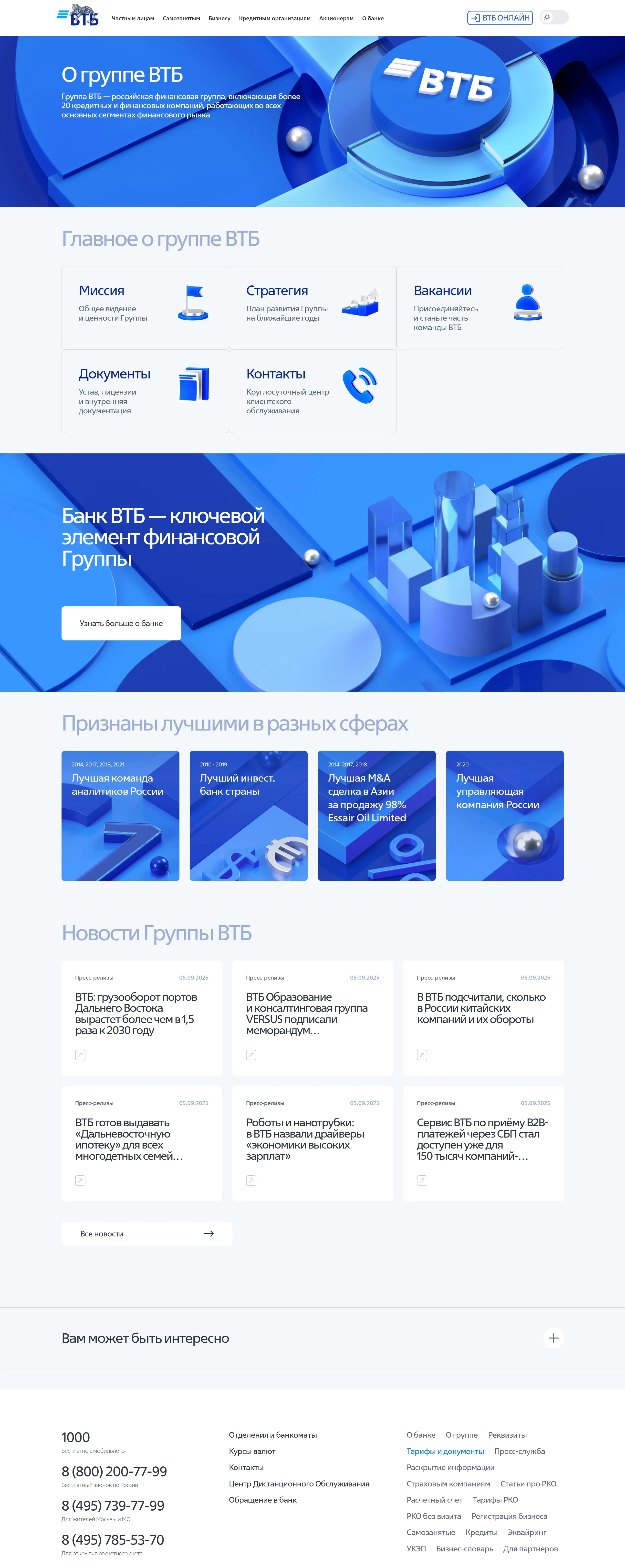 Страница о компании ВТБ, тематика — Финансы, цвета — Белый, Синий, стиль — Корпоративный, типографика — Без засечек