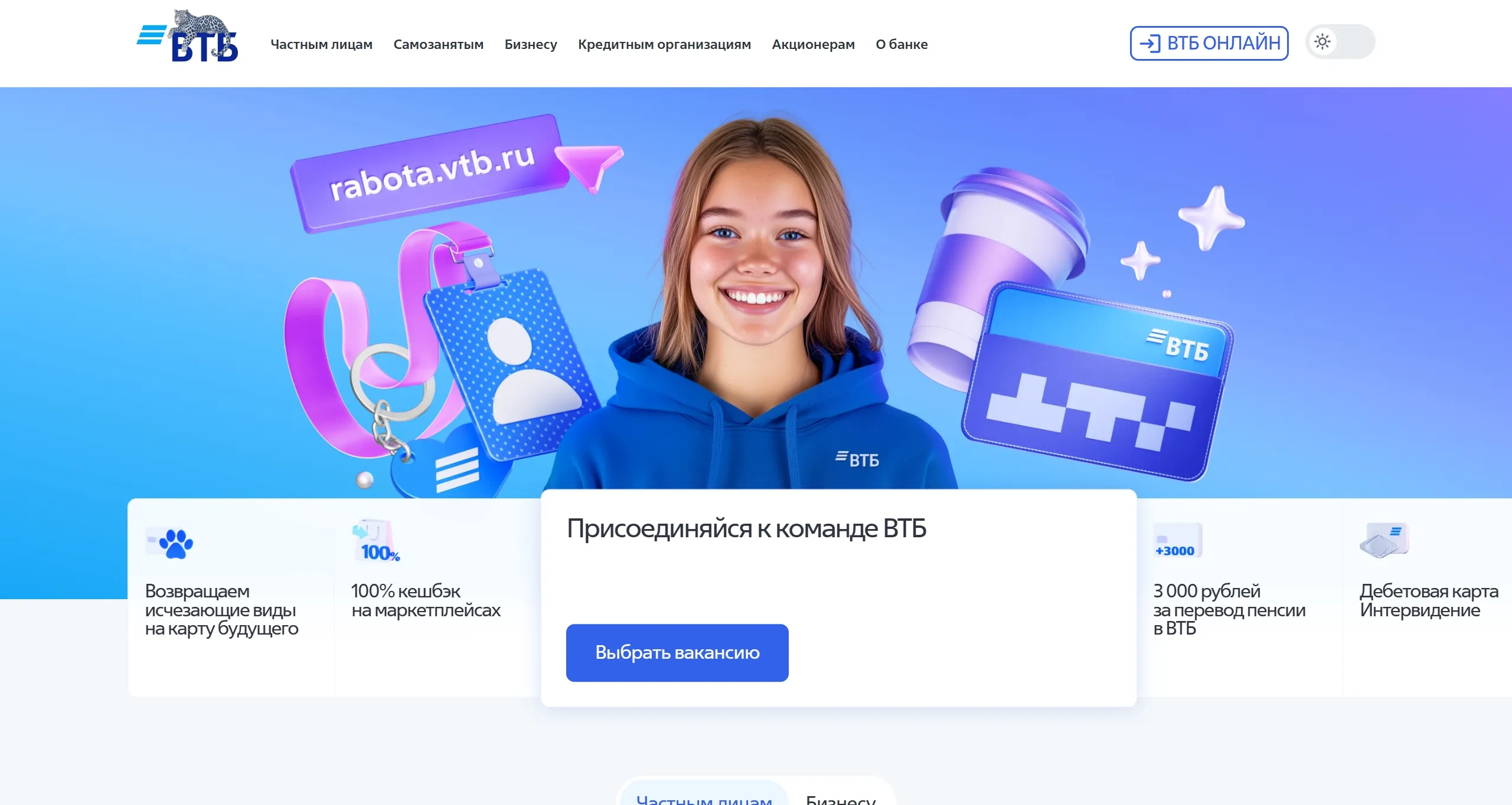 ВТБ - это российский банк, предлагающий широкий спектр финансовых услуг для физических и юридических лиц, включая дебетовые и кредитные карты, ипотеки, кредиты и вклады. Банк также предоставляет услуги для бизнеса, такие как расчетно-кассовое обслуживание и эквайринг.