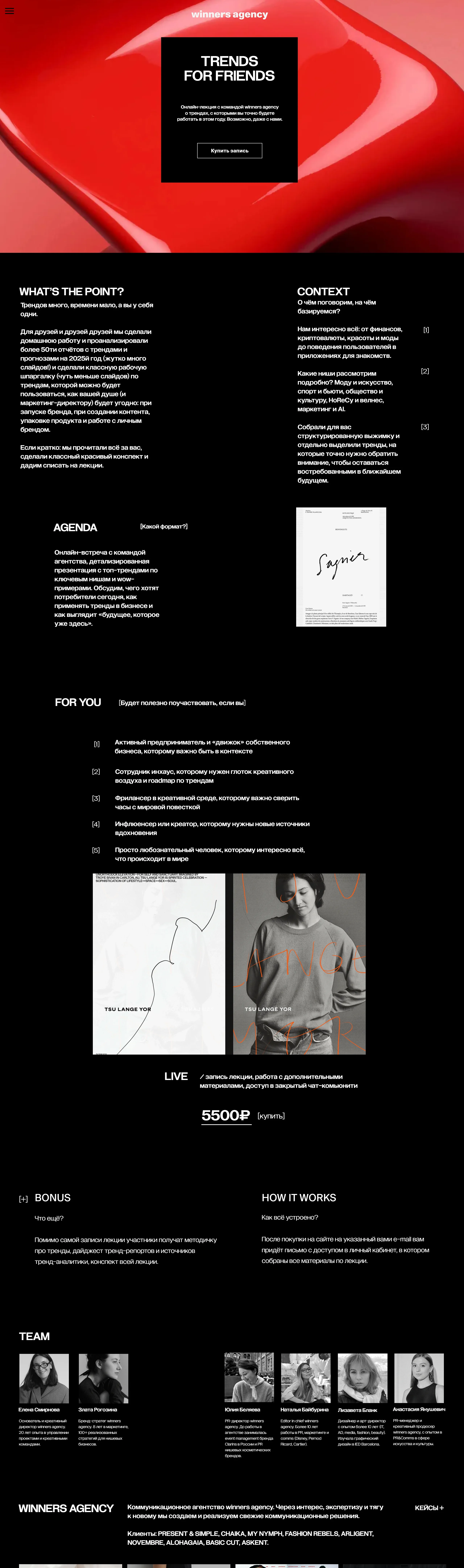 Коммуникационное агентство, которое создает и реализует свежие решения в области брендового дизайна и коммуникации, сотрудничая с брендами в разных сферах, таких как мода, красота, еда и стиль жизни.