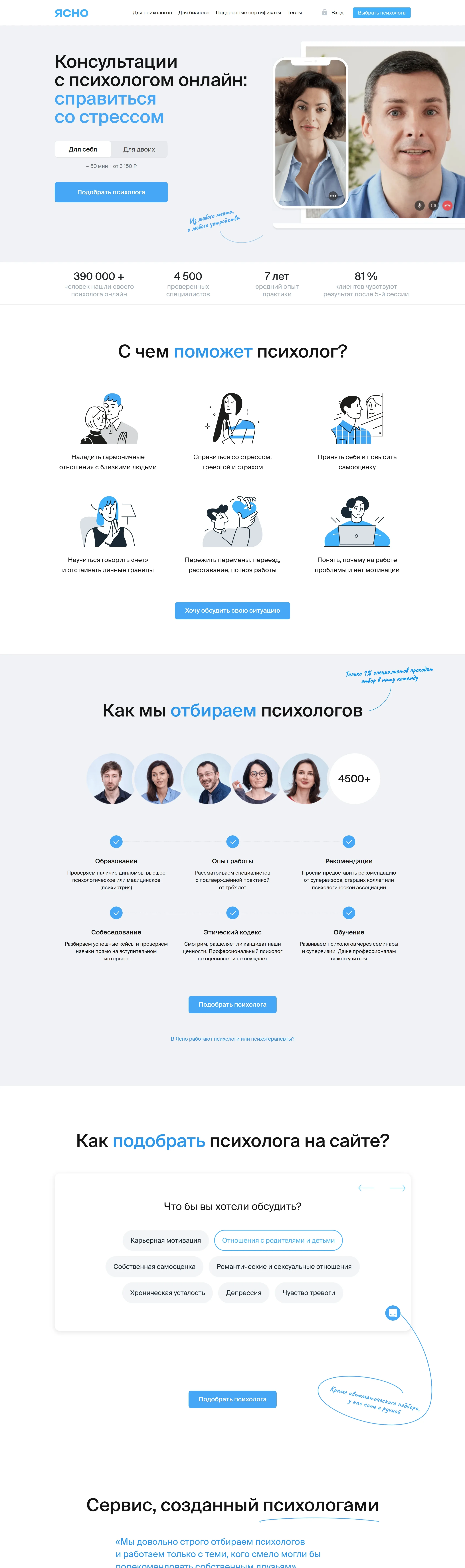 Главная Yasno, тематика — Психология, цвета — Белый, стиль — Корпоративный, типографика — Без засечек