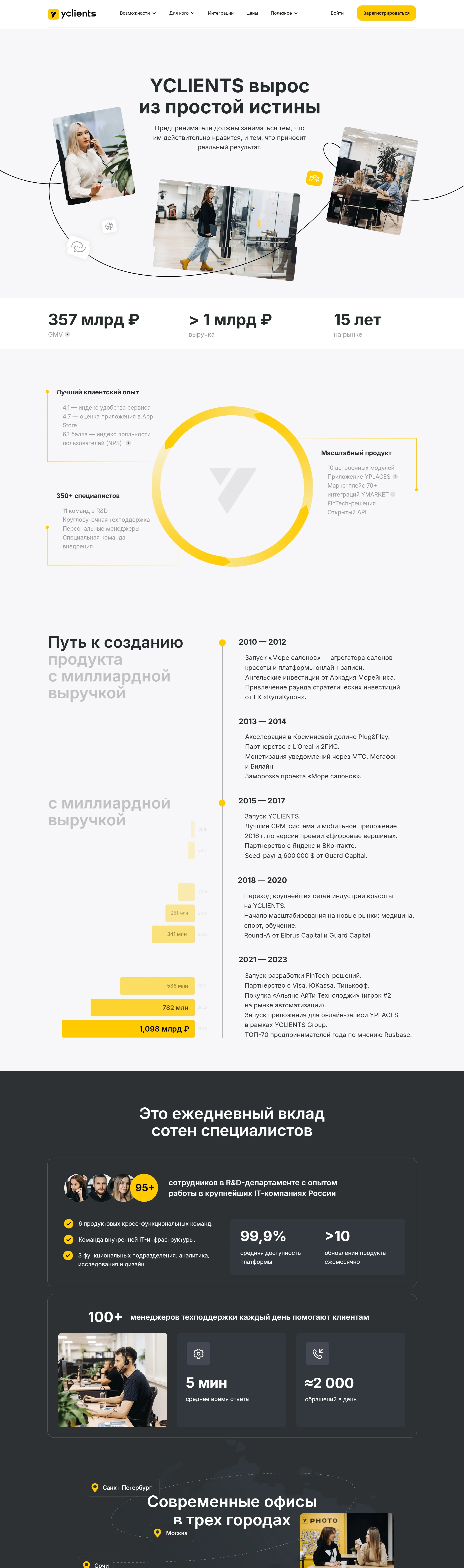 Секция «О продукте» с сайта https://www.yclients.com/, тематика — SaaS, цвета — Белый, Черный, Серый, стиль — Корпоративный, типографика — Без засечек