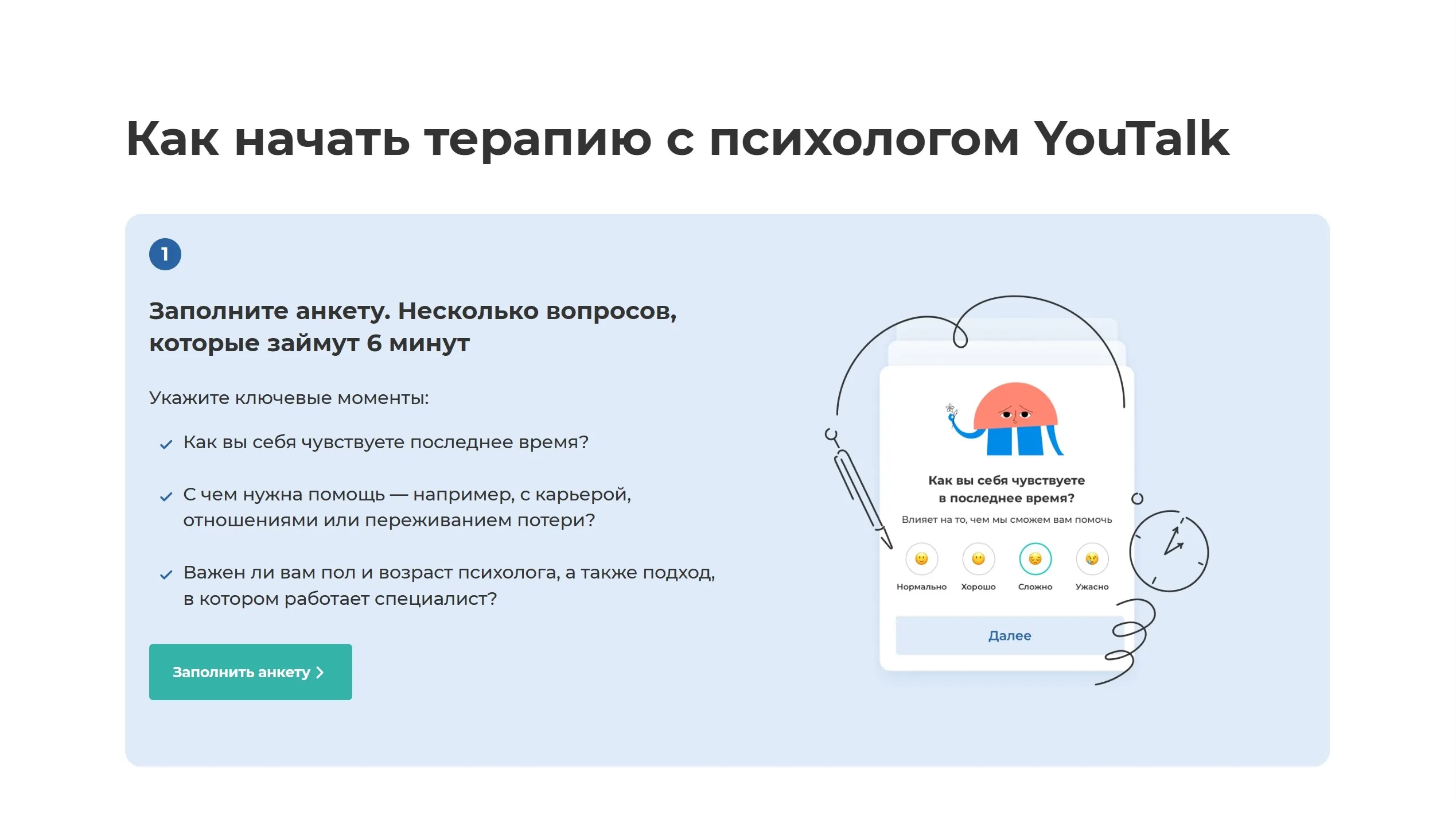 Сервис предоставляет онлайн-психологическую помощь, предлагая более 280 специалистов и возможность анонимного приема с быстрым подбором психолога под конкретные проблемы.